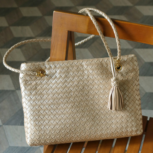 Rare Bottega Veneta Vintage Shimmer Ivory Pearl Intrecciato Braided Strap Shoulder Bag