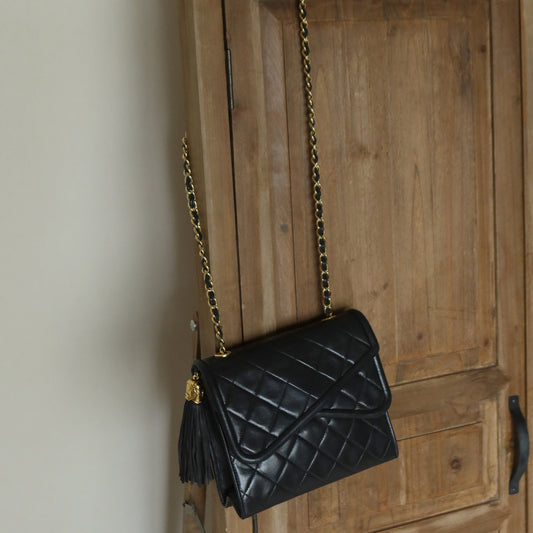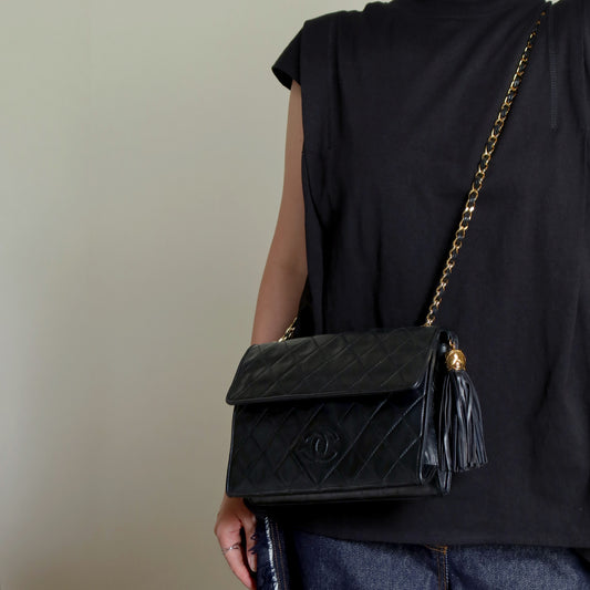 Chanel Vintage Black Lambskin Tassel Quilted CC mark Flap Bag