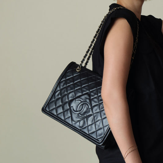 Chanel Vintage Black Quilted Chocolate Bar CC Mark Shoulder Tote Bag