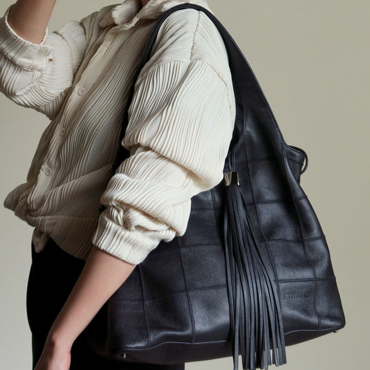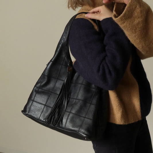 Chanel Vintage Black Square Stitching CC Tassel Hobo Tote Bag