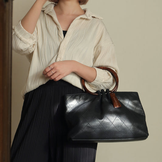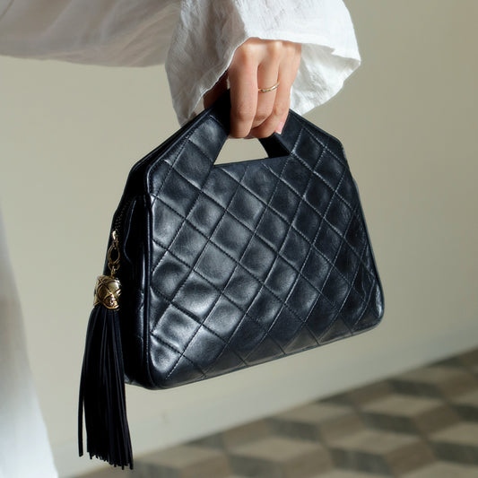 Chanel Vintage Black Matelasse Quilted Tassel Top Handle Shoulder Bag
