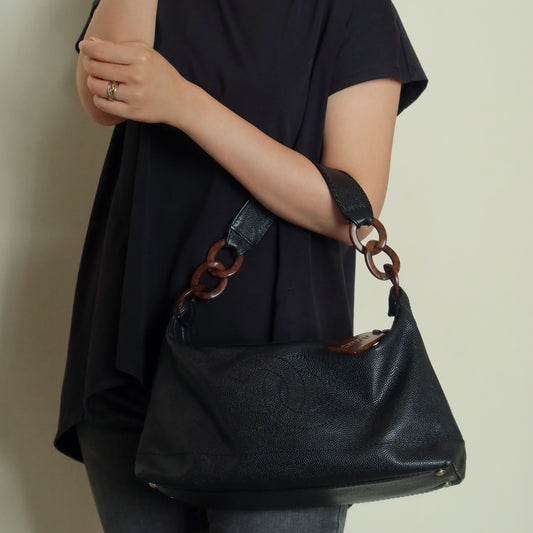 Chanel Vintage Black Caviar Leather Hobo Coco Shoulder Bag