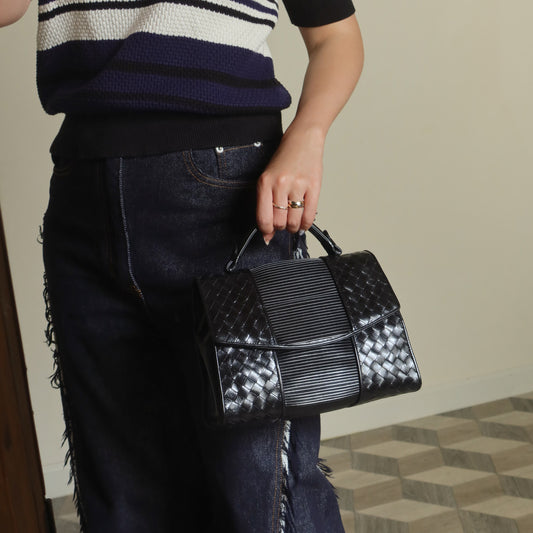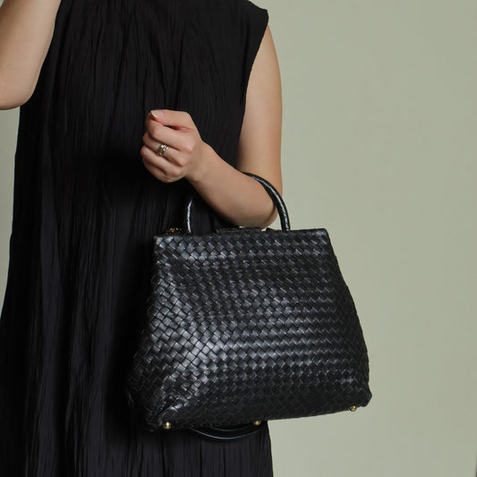 Bottega Veneta Vintage Black Intrecciato Turn Lock Braided Top Handle Bag