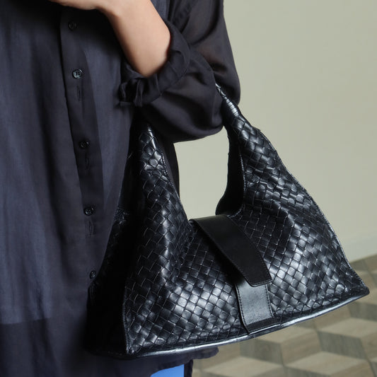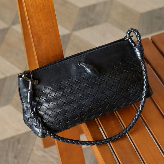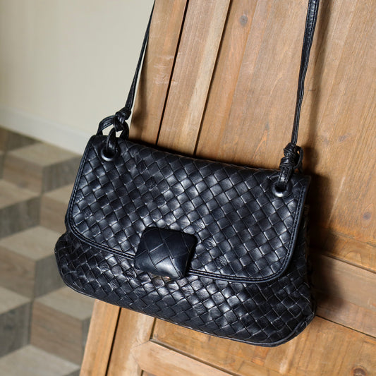 Bottega Veneta Vintage Black Intrecciato Weave Leather Strap detail Shoulder Bag