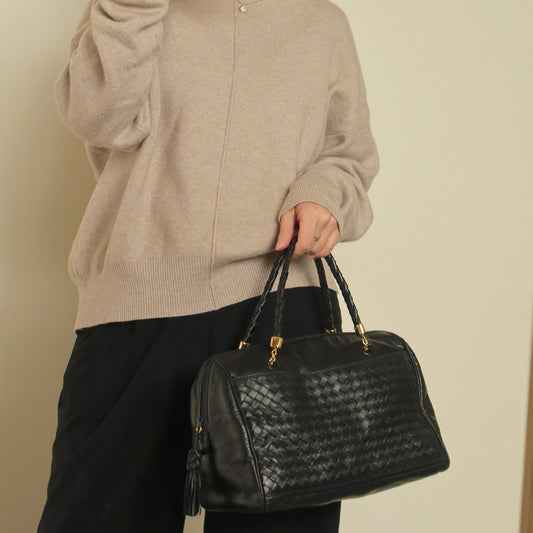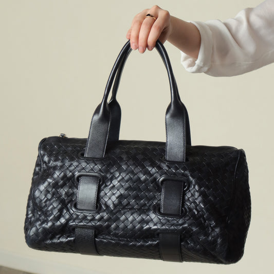 Bottega Veneta Vintage Black Intrecciato Braided Handle Boston Bag