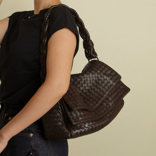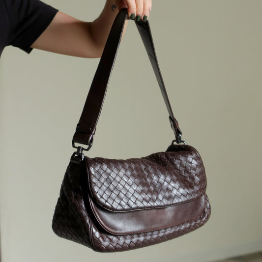 Bottega Veneta Vintage Dark Brown Intrecciato Flap Hobo Shoulder Bag