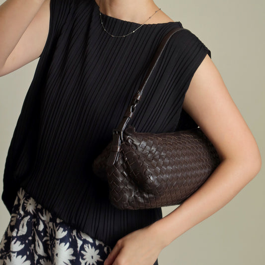 Bottega Veneta Vintage Dark Brown Grained Leather Cross Stitching Shoulder Bag