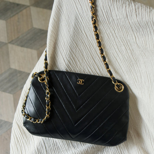 Chanel Vintage Black Lambskin Chevron Quilted Kiss Lock 2way Bag M