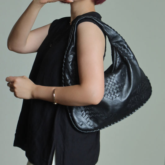 Bottega Veneta Vintage Black Intrecciato Leather Hobo One Shoulder Bag