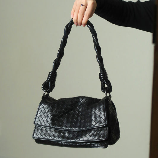 Bottega Veneta Vintage Black Intrecciato Twisted Strap Double Flap Shoulder Bag S