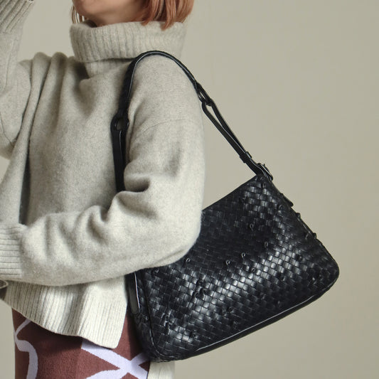 Bottega Veneta Vintage Black Intrecciato Leather Relaxed Shoulder Bag