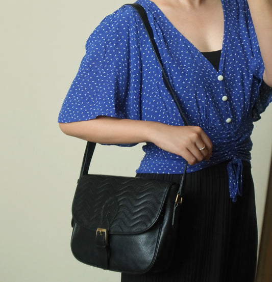 Yves Saint Laurent YSL Vintage Black Leather Wave Stitching Shoulder Flap Bag