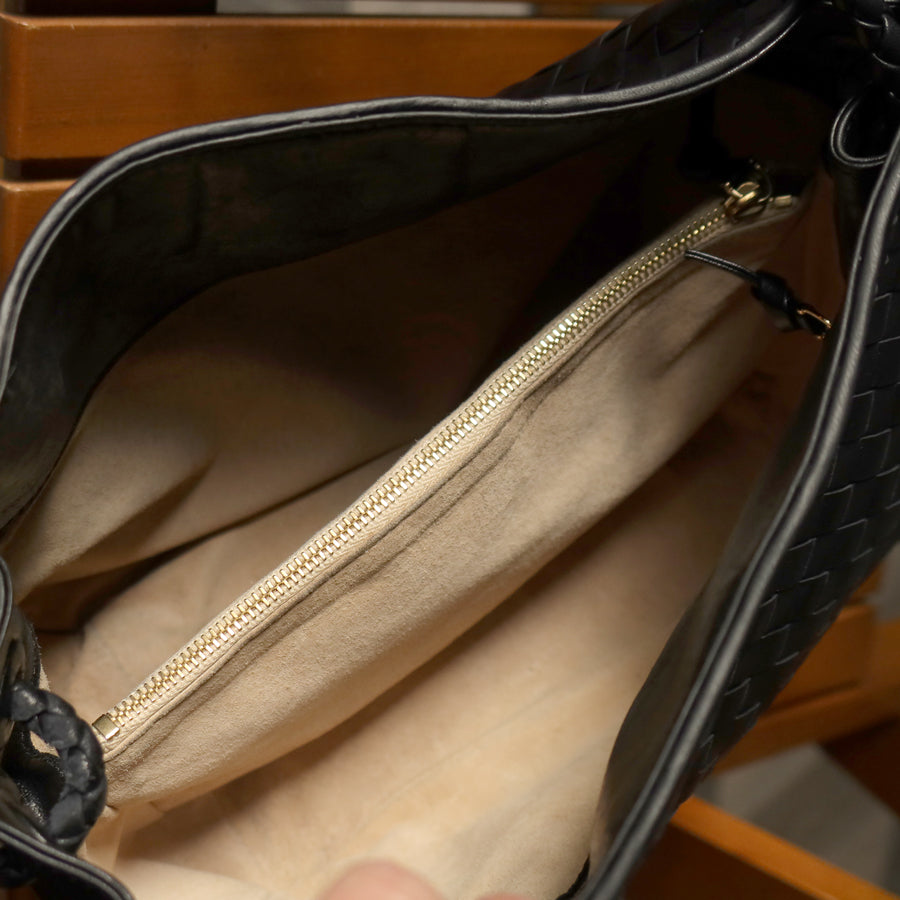 The design of this bag is soft and curvy, like all Bottega hobo bags; but the bottom is well designed to hold more weight without deforming (a rather flat bottom). You'll love how versatile it is. An ultimate city bag that's classic and elegant from Bottega.