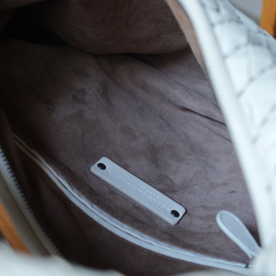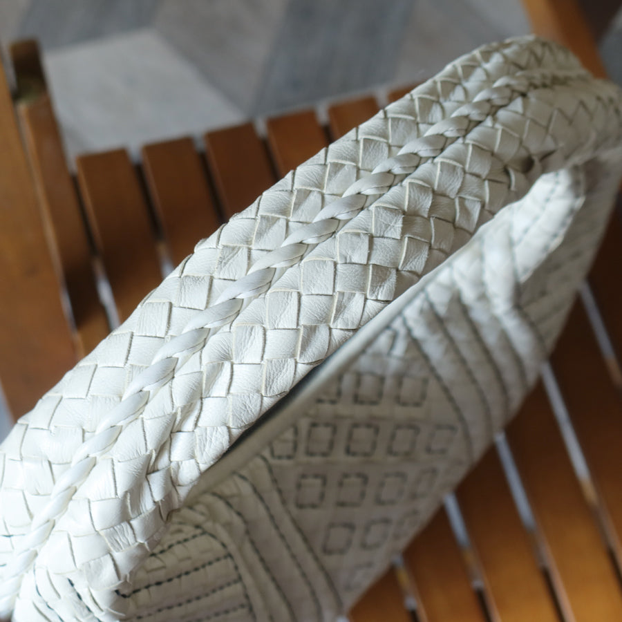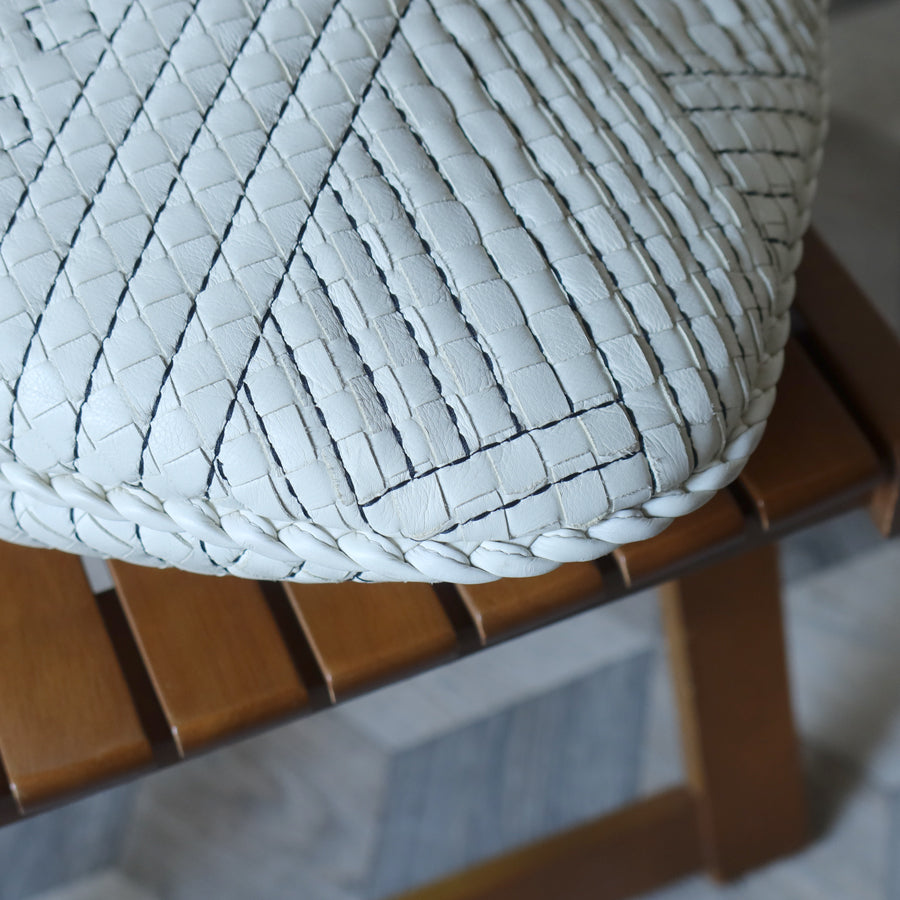 A classic, iconic Veneta hobo bag from vintage Bottega Veneta, this is a lovely vintage piece in a limited edition design—white based nappa leather and dark navy stitching, creating a beautiful pattern on the intrecciato weave! Collector's beware ;)