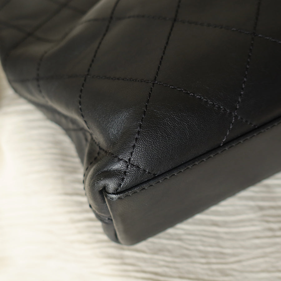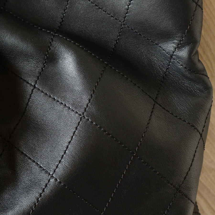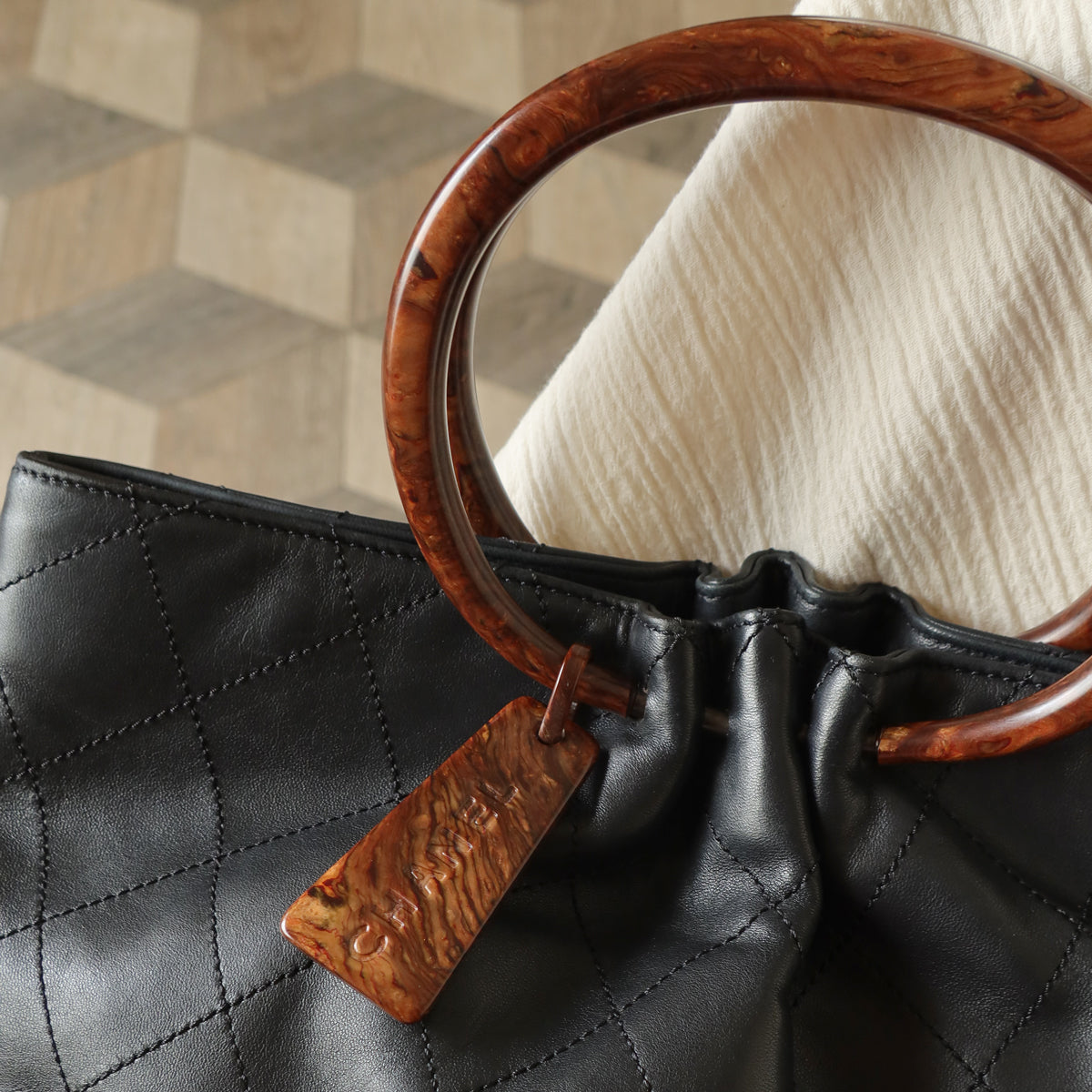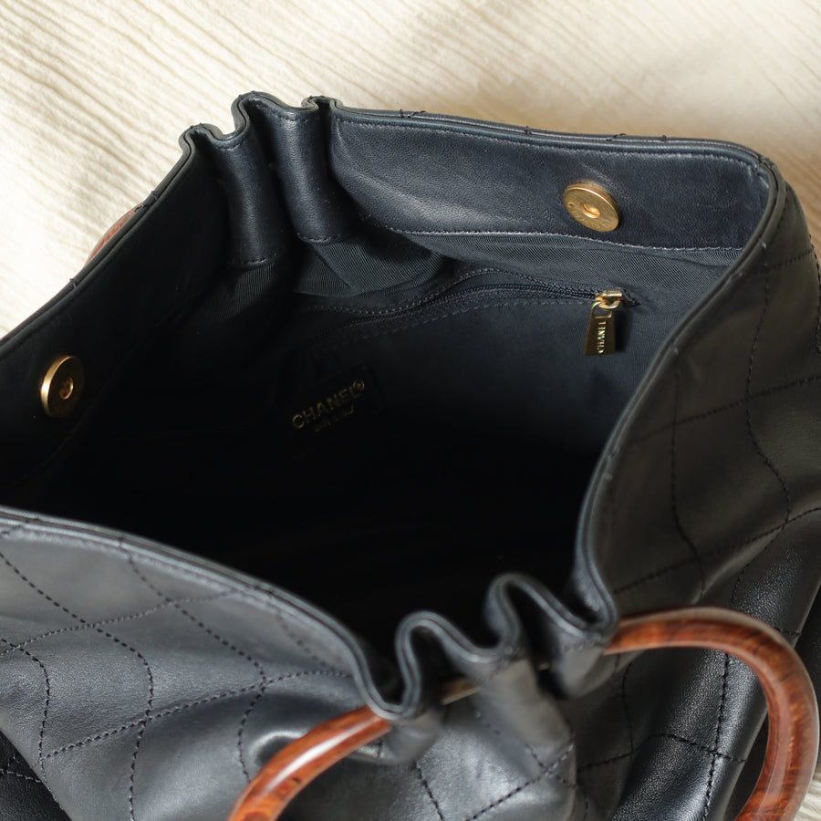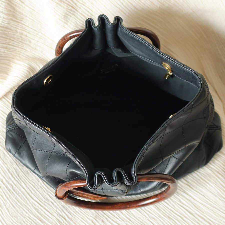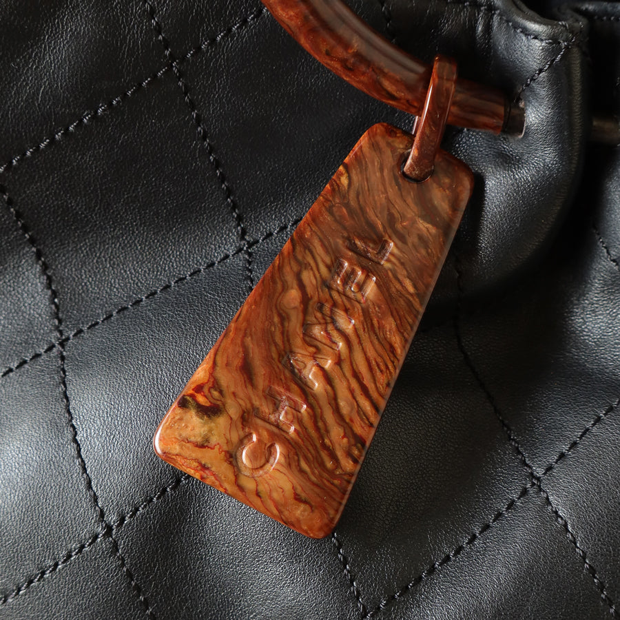 The black lambskin leather mix with black tone-on-tone stitching & the fun wood-like resin handle & Chanel logo charm is such a chic combo. A quiet luxury bag that's timeless in all seasons. A extremely easy bag to style with, too.