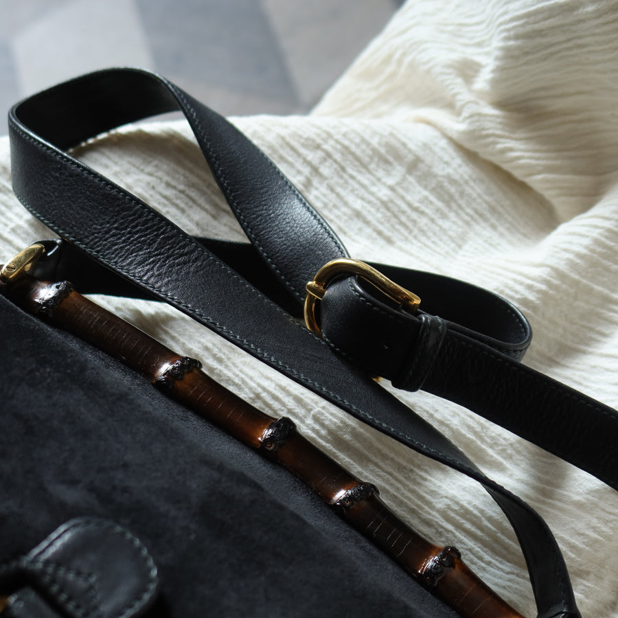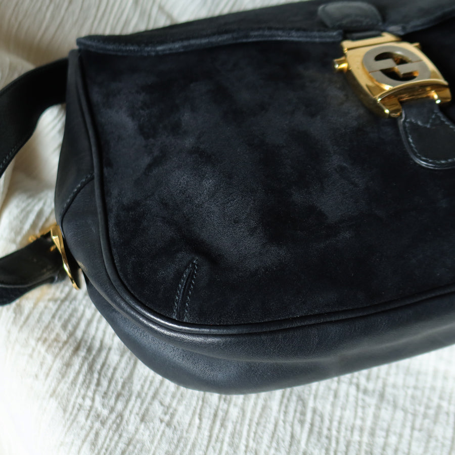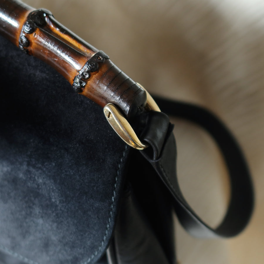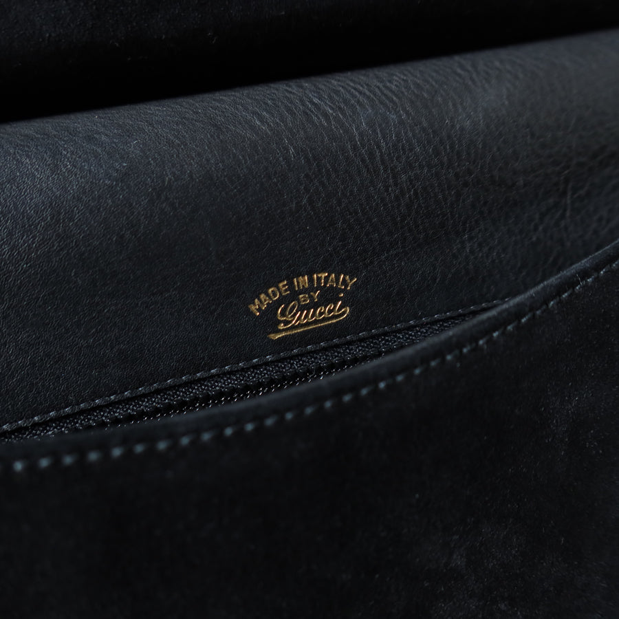 Gucci Vintage Black Suede Leather Bamboo Handle Gold Buckle Shoulder Flap Bag