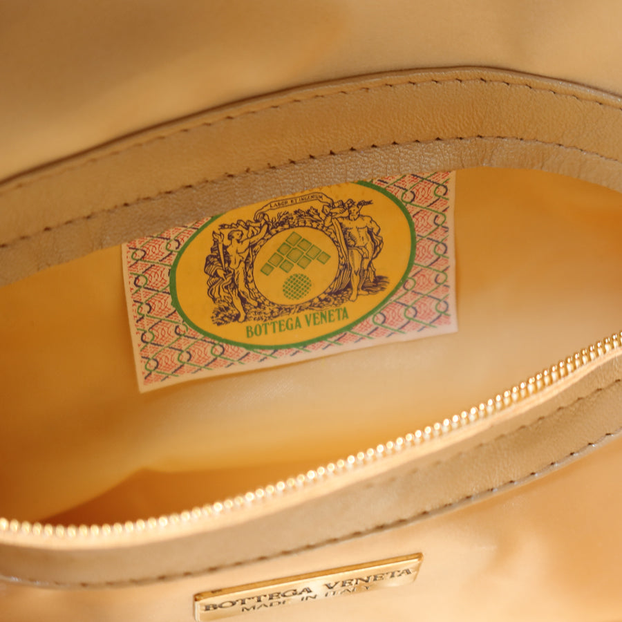 I like that there's a large compartment inside with a rather big zipped pocket, which is helpful for organising smaller items. The interior is lined with a beautiful satin bottega graphic fabric, and it's in like-new, pristine condition! What a gem.