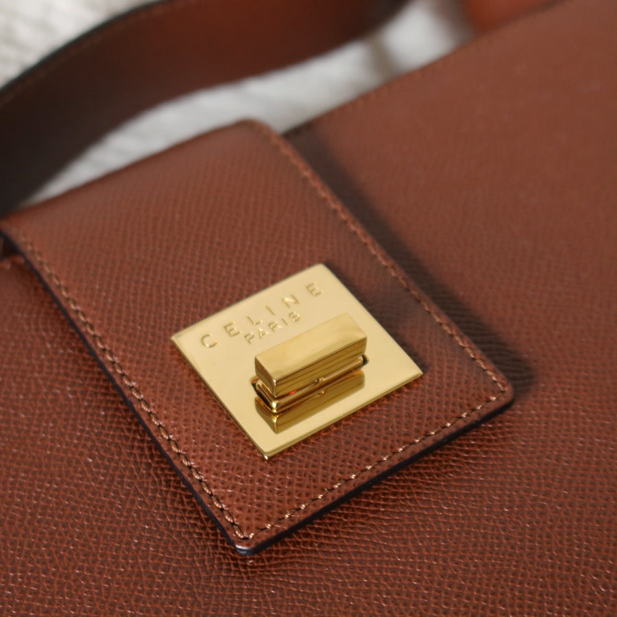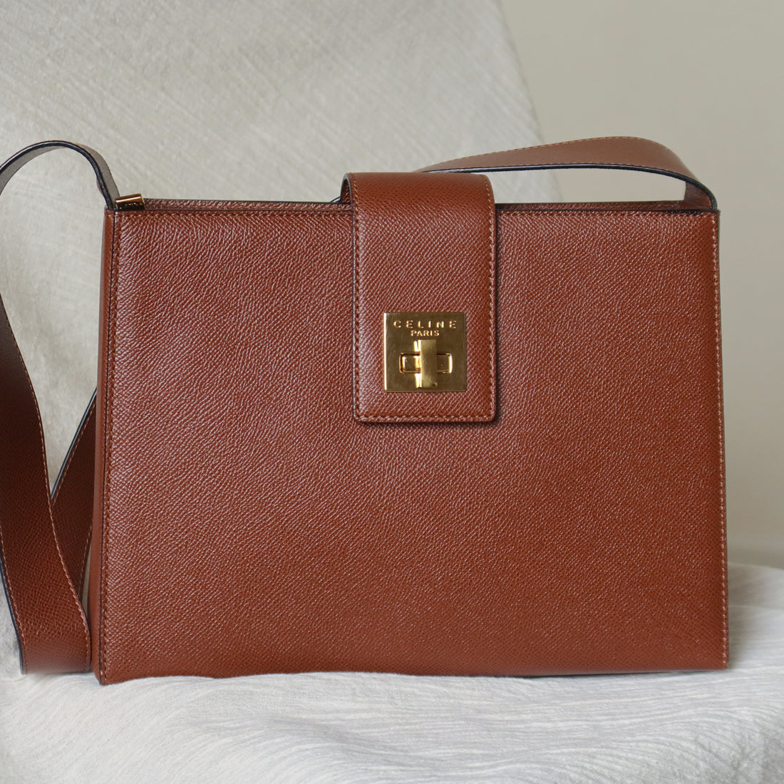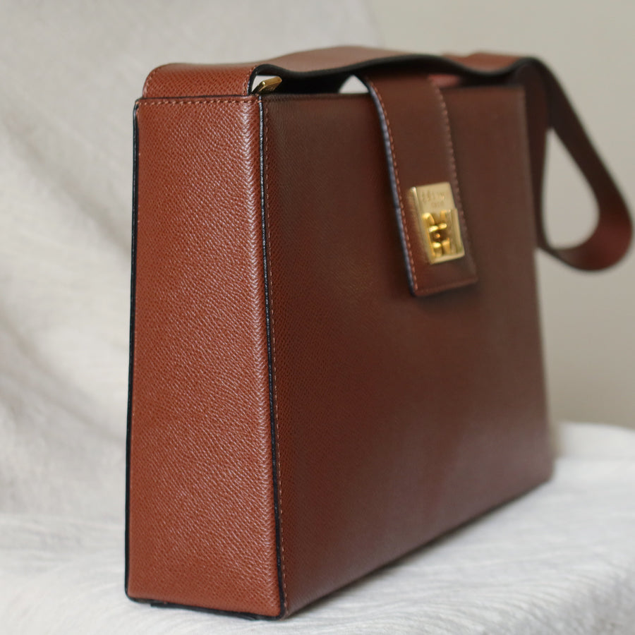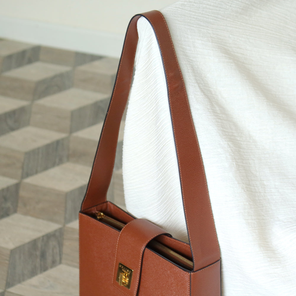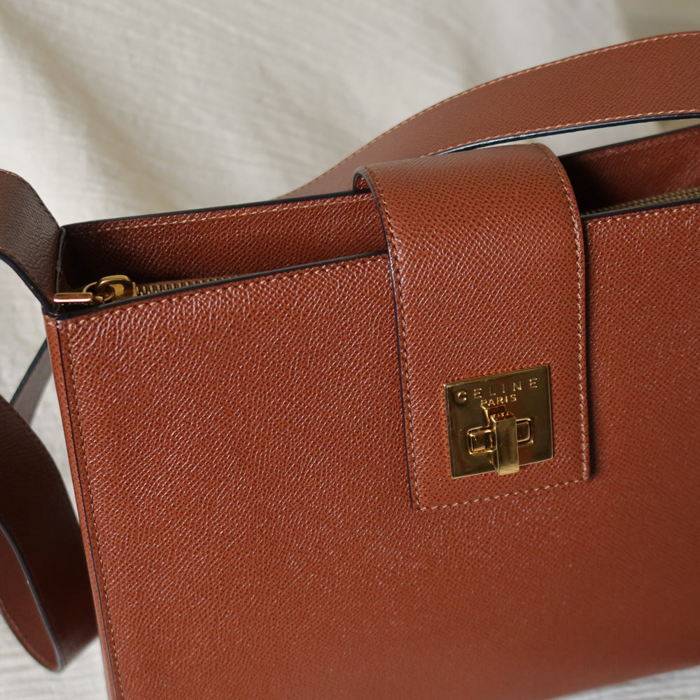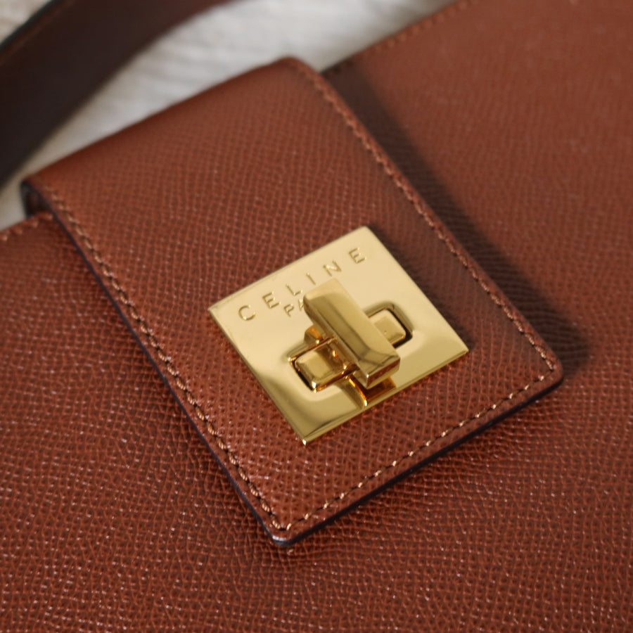 Rare Celine Vintage Cognac Brown Leather Gold Turn lock Shoulder Bag
