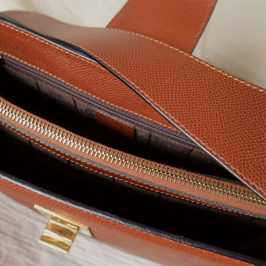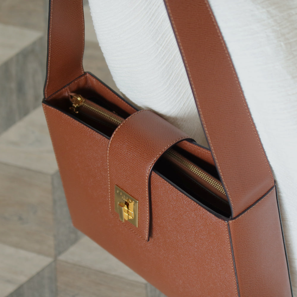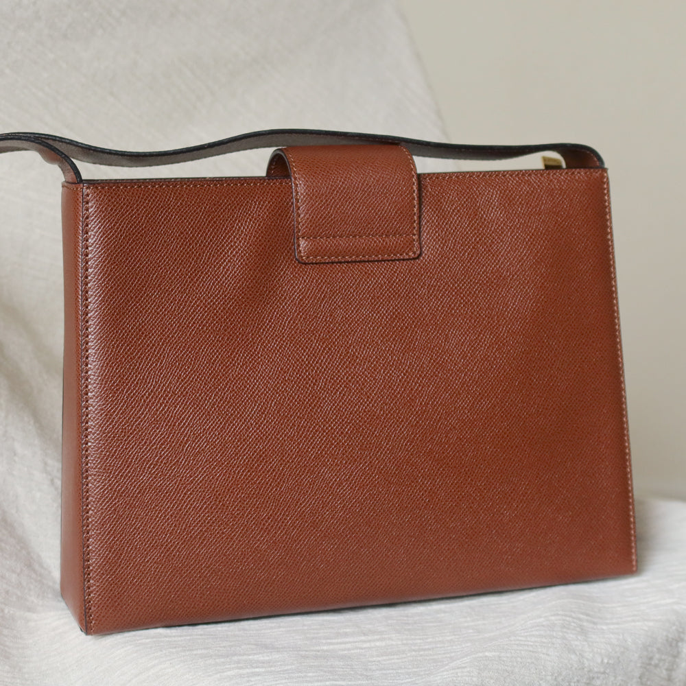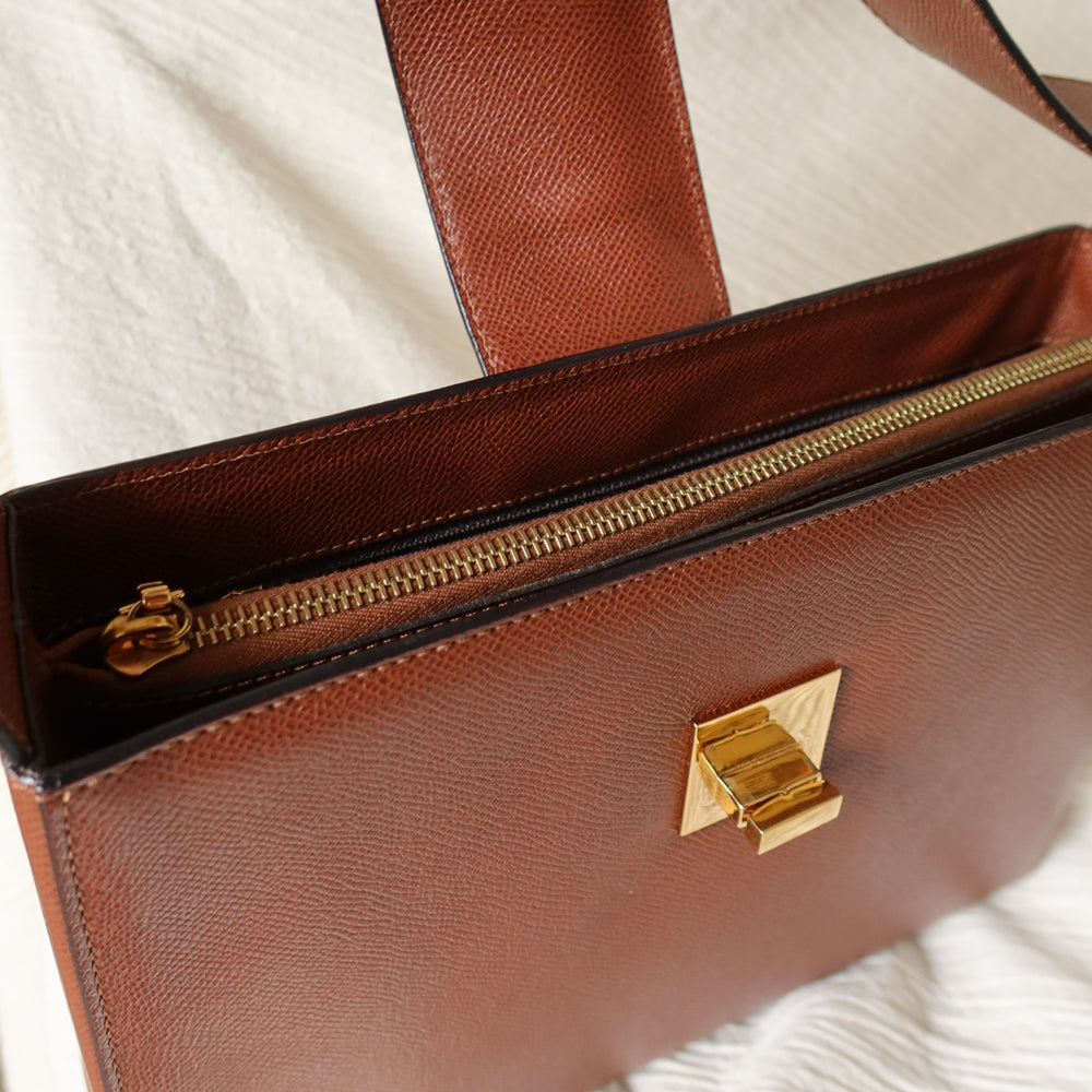A chic shoulder bag from early 2000s that is extremely rare, in this exquisite cognac brown grained calf leather and stunning gold hardware turn lock, you won't find it anywhere now!