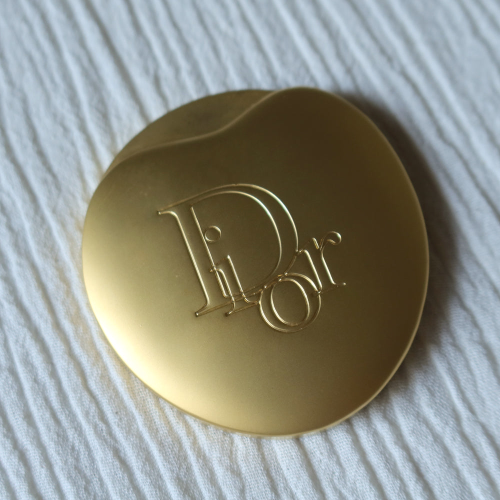Dior engraving monogram on heart shaped gold compact, slides up from right side revealing a mirror inside. So cute, so chic!